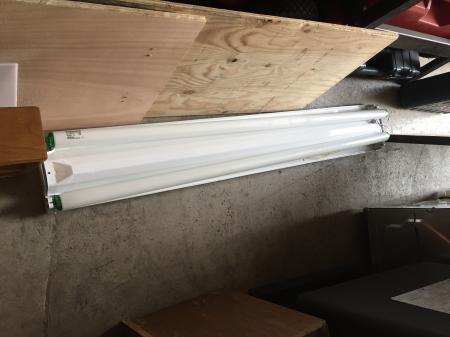 2 working ceiling light fixtures just removed from our kitchen. Wooden box cover on fluorescent fixture is over 3'' long and contains 2 bulbs. Standard flush fixture, brushed chrome, 2 bulb, glass globe. $10 each Call text or email susantone@nehalemtel.net 503/354-4072