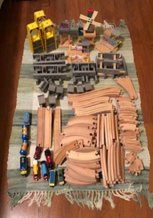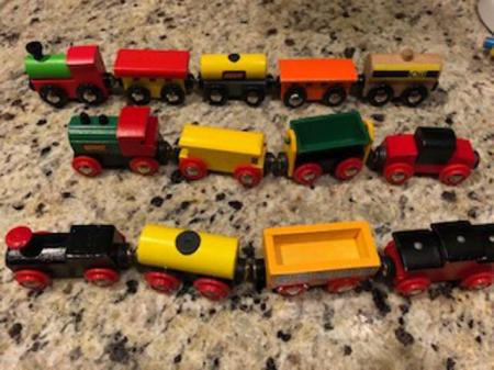 My grandson and I enjoyed many hours of fun running these tracks and trains all over the house. It was his favorite thing to play when he visited. But, as kids do, he grew up. So, for some other lucky kids, here are some lots of tracks, trains and accessories for sale. They are mostly Brio, plus Circo, Soder, Melissa and Doug, and Ikea, all of which are compatible.
