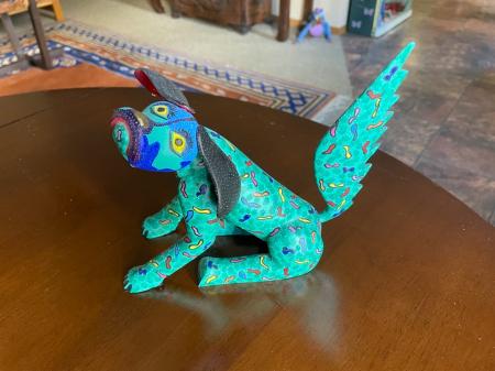 From by personal collection which started 35 years ago. This piece was purchased from Milagros in Seattle 30 years ago. Jesus produces some of the most whimsical and colorful carvings to be found! Interestingly, he actually did not start as a carver. He was an electrician when he became ill with typhoid fever. Being from the traditional carving village of San Martin Tilcajete, Oaxaca, he decided to try his hand at wood carving. One day he was at the doctors office, and started reading the medical journals. He became fascinated with the amoebas that he saw in one publication, and decided to use that as his signature pattern. The pattern takes on a look similar to jelly beans– bright, colorful and full of good cheer!