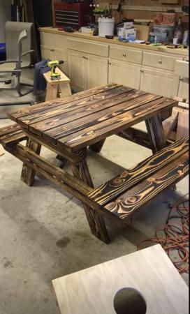 We have a 5’ custom picnic table made for us last year, Spring of 2022. It has attached legs. We have never used this table, purchased it for a business we never launched. It has been under cover throughout the winter.