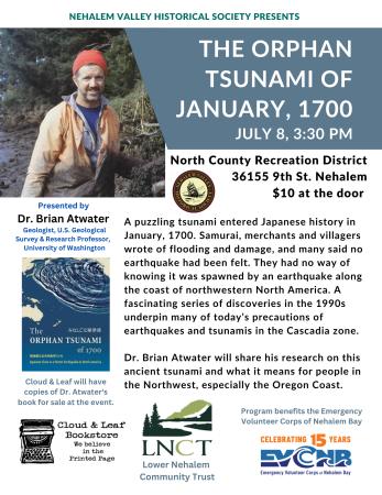 Nehalem Valley Historical Society is bringing renowned author, Brian Atwater, to NCRD on Saturday at 3:30 to talk about his book, The Orphan Tsunami of 1700. This program benefits EVCNB and is co-sponsored by EVCNB and the Lower Nehalem Community Trust. Cloud & Leaf will be on hand for book sales. It’s a great community event. Earlier in the day, at 9:00 – 10:30, Brian will be available at Offshore Grill. You can get the book next door at Cloud & Leaf, then have Brain sign it for you!