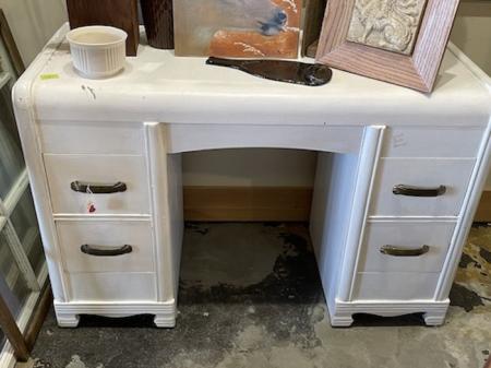 White desk or vanity is 42″W x 17.5″D x 28″H. 4 Drawers