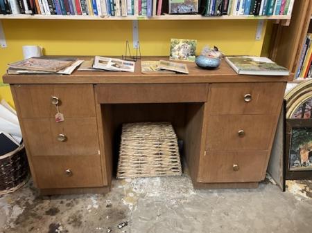 Brown desk is all wood, measures 54″w x 21″D x 30″h. Has three draws on each side and middle one for pencils and supplies.