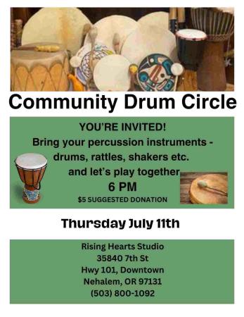 Our Community Drum Circle is tomorrow, Thursday, July 11th at 6 PM, here at Rising Hearts Studio, we’ll be in the courtyard. Bring your percussion instruments-drum, rattle, shakers – and let’s have fun – This is a FREE event open to ALL, with donations gladly accepted.