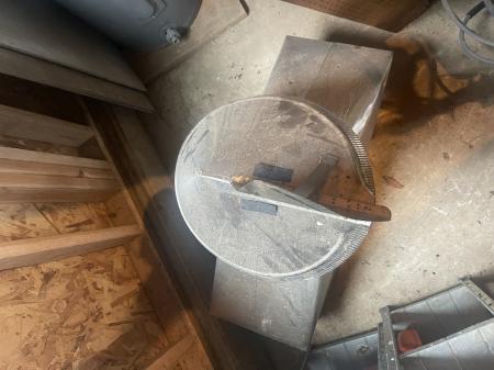 Wind-directional (“conquistador”) style chimney cap. Dimensions: 3’ x 1’ x 3.6’ (tall).