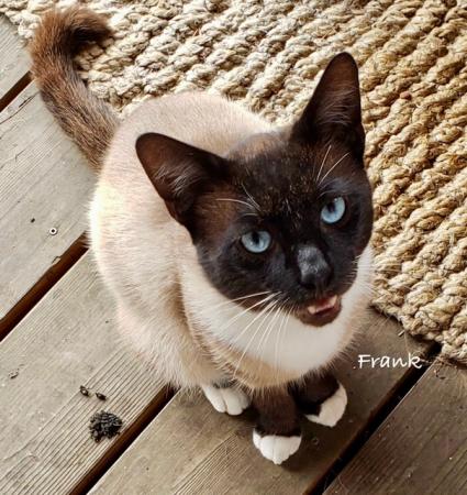 Frank is a chocolate point snowshoe Siamese who is named after Ol’ Blue Eyes himself. He was abandoned but luckily found his way to a friendly house about six months ago. He was very guarded from having to survive outside, but with loving, consistent care Frank became more comfortable and trusting. He enjoyed the companionship of the home’s visiting chickens, even cuddling up with one of them in his bed, and