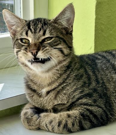Sharky wakes up with a smile and is always in a happy mood. He enjoys other cats, playing with feather toys, a kick sock, and lounging in a sunny spot of the house. Sharky comes running when called, travels well, plays fetch, and is even an accomplished bug hunter! Sharky isn’t a lap cat but doesn’t mind being held as long as there’s petting involved, and is an affectionate boy that will gladly snuggle up to your neck or your feet at bedtime.
