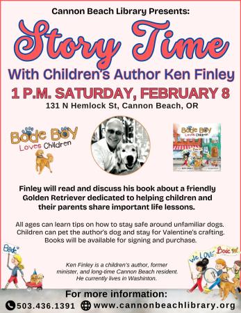Children’s author Ken Finley will be at the Cannon Beach Library on Saturday, February 8 at 1 p.m. to read and discuss, “Bode Boy Loves Children,” his book about a friendly Golden Retriever dedicated to helping children and their parents share important life lessons. All ages can come learn some tips on how to stay safe around unfamiliar dogs. Children can pet the author’s dog and stay for Valentine’s crafting! Finley will also discuss his experience writing and publishing children’s books. Copies of “Bode Boy” will be available for signing and purchase. All ages are welcome!
