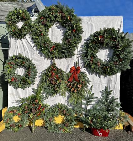 Wreaths & Swags, AND Noble Fir Christmas Trees are available.