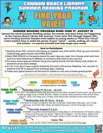Summer Reading, prizes, fun events, and story times are happening at the Cannon Beach Library this summer. From June 17th through August 19th, we’re inviting Summer Readers from babies to young adults to “Find Your Voice!” Come explore how to wield the power of your voice – words, writing, art, music, and actions – to express yourself and help shape your world.