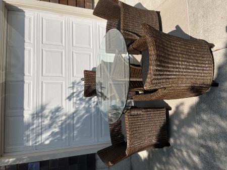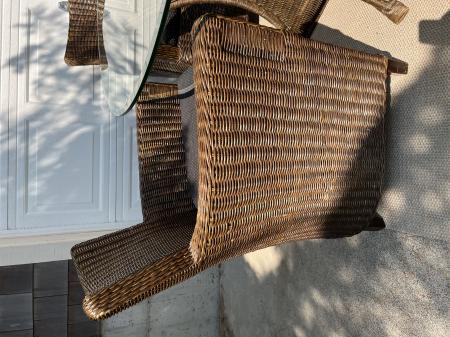 Vintage rattan kitchen table and chairs. Handmade in Indonesia. Very good shape. Hand bevelled glass top impervious to all but a hammer. Supremely comfortable chairs with highest quality foam and seat covers.