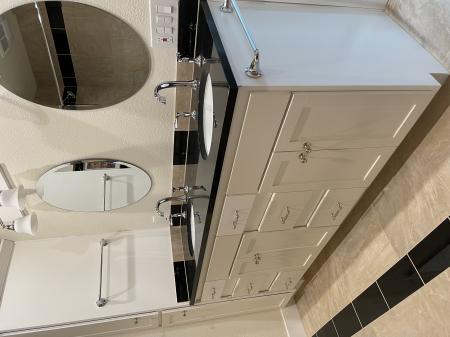 White Double Vanity with Black Granite Counter and 2 oval white sinks included. Tiny chip in counter under right sink faucet. Faucet, handles, towel rod, sconces, and oval mirrors available, too! Spacious cabinets below. $300 OBO. U-haul. Cannon Beach.