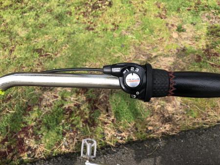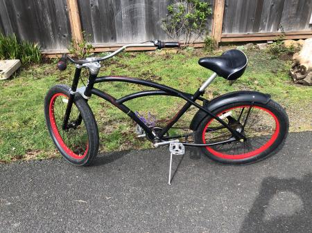 PHAT cycle black bicycle with wide 3-inch tires $50. Has 2 of 3 gear/speeds working, and is otherwise functional for cruising around. Coaster brakes (you pedal backwards to engage the brake.) wide seat. Seat and hand grips might be leather and are in good condition. Heavy duty bike. Bike has wear and tear, mostly from riding in and around Nehalem Bay SP, by me and the previous owner. As far as I know this has always been a Manzanita bicycle.