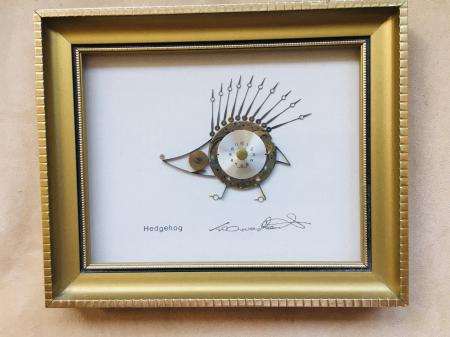 Ingenious creation of a hedgehog made entirely out of retro watch parts. Spikes, body, even the nose and feet are made from watch parts. Gold framed in depth with a hanging hook. 7-1/2” by 6”” of delight! Only $50 and all money will go to Save the Children’s Ukraine campaign. It would make a unique Mothers Day or birthday present.