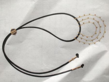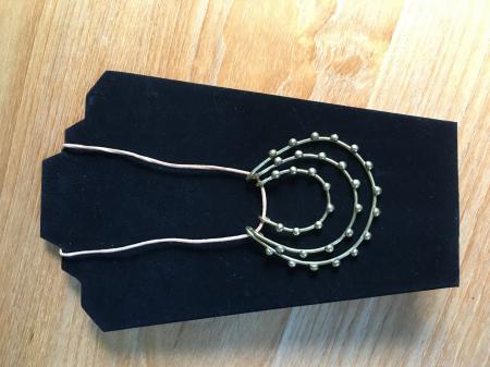 Berber-inspired Hamimi handcrafted tri-loop necklace for sale to benefit the children of Ukraine. Three brass-dotted loops on an adjustable leather band. Total length approx 24” with loops 4” long. Comes in signature Hamimi jewelry pouch.