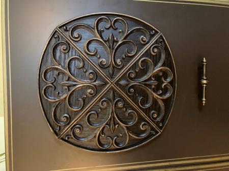 Vintage wardrobe for sale. 63″ tall x 36″ wide x 19.25″ deep. Brown with gold details. Light weight for size. Some minor dents and markings.