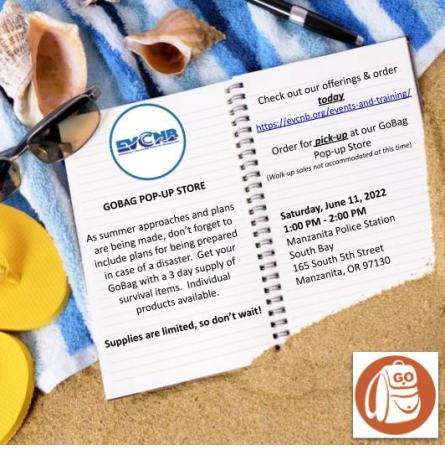 GoBag Pop-Up Store June 11, 2022 Posted on June 4, 2022June 4, 2022 by North Coast BBQ Submitted By: brad.hart@evcnb.org – Click to email about this post Don’t forget to order your GoBag and supplies for pick up on Saturday, June 11 in Manzanita. evcnb.org/events…/gobag-popup-06112022-f4fch-rhcrp