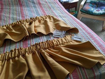Yellow ocher (gold) window valances, four panels, 52″ x 18″, blackout tech faux silk fabric, perfect condition, $25 for all.