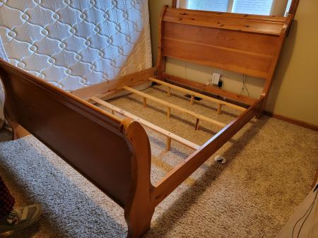 For Sale: Queen Sleigh Bed in good condition. Some wear but solid.