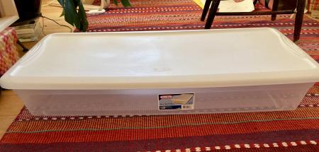 6 lightly used Sterilite storage containers. Designed to fit well under beds.