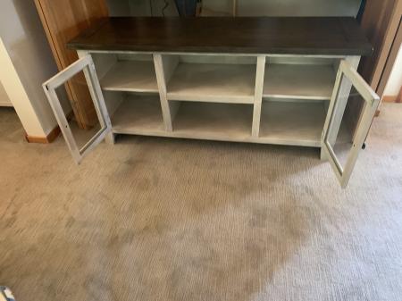TV Stand/entertainment center Posted on July 25, 2022July 25, 2022 by North Coast BBQ Submitted By: bonniesavickas@yahoo.com – Click to email about this post Excellent condition – $100 – 57 1/2” long purchased from Roby’s last year – 6 shelves – 2 enclosed w/glass – wood grain top