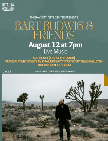 Friday, August 12 at 7pm, come join us at the Bay City Arts Center for a live band with Bart Budwig & Friends, a “cosmic country” musician described as “one of the most underrated musicians in Oregon” by OPB. Tickets are $20 by visiting our website, or $25 at the door. Doors open at 6:30pm, and the show starts at 7pm. Purchase tickets here: baycityartscenter.weebly.com/performances.html