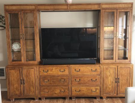 (center section now holds a 55” Samsung smart TV .. diagonal measure) .. open cabinet area measures 52” side to side.