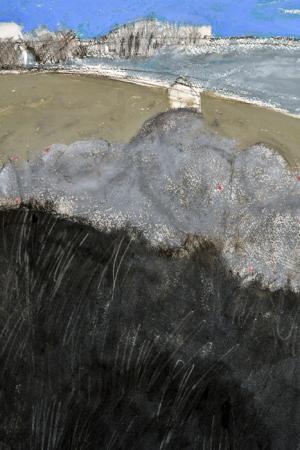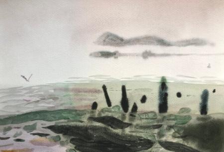 “I paint watercolors, soaking the paper, sometimes on both sides and applying washes of color and tone wet on wet to create atmosphere and form. As the paper dries I add detail and structure using sketchbook and memory as source material. I like to paint the shapes of birds and sea stacks; the vertical staccato of old river pilings, the wake of ducks on the river.”