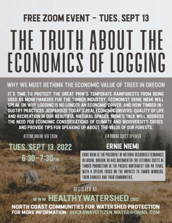 North Coast Communities for Watershed Protection (NCCWP), which advocates to protect our local drinking watersheds, is excited to announce an upcoming talk with economist Ernie Niemi,“The Truth about the Economics of Logging” Online Event. The event will take place online via Zoom on September 13 at 6:30 p.m. PT.
