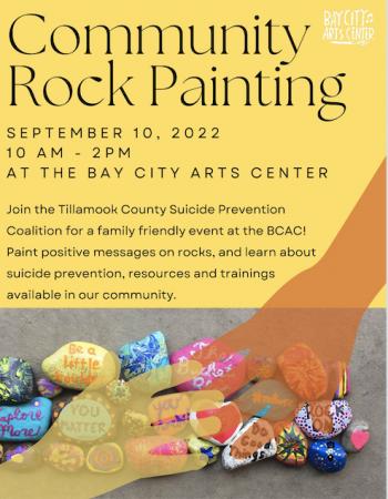 Join the Tillamook County Suicide Prevention Coalition on Saturday September 10th from 10am-2pm at the Bay City Arts Center for a family friendly event! Paint positive messages on rocks donated by Averill Landscaping Materials, and learn about suicide prevention, resources and trainings available in our community.
