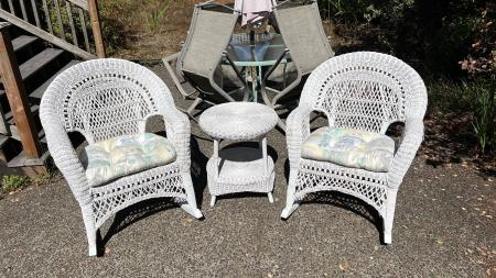 These chairs and matching table are in good shape. There are no significant structural issues or wicker problems. They’ve been stored in a garage during wet weather. Comes with two cushions for added comfort.