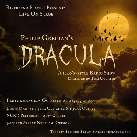 There’s a chill in the air and the leaves are beginning to fall. It’s that time of year and ghosts fly and monsters awaken. Join us for this thrilling live on stage, 1940′-style radio show. It’s DRACULA!