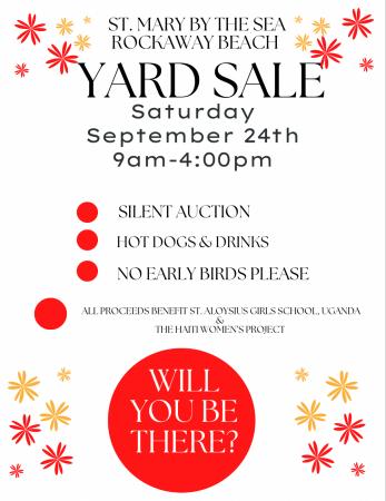 Reminder: HUGE YARD SALE at St. Mary’s By the Sea in Rockaway Beach, Saturday, Sept.24, 9AM to. 4PM. Treasures Galore: fishing tackle, toddler clothes & shoes, beach and home decor, dishes, bikes,cooking and baking needs! To benefit St. Aloysius School for Girls in Uganda and Haiti Women’s Project. Great Treasures for a great cause!
