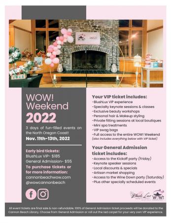 Want a great excuse to support the library and escape to the beach for some fun with your friends? Join WOW! Weekend November 11th – 13th, 2022. Proceeds from general admission sales for WOW! Weekend will be donated to the Cannon Beach Library.