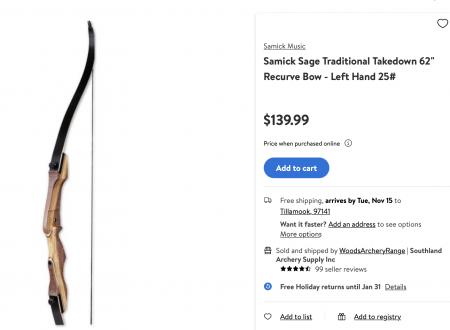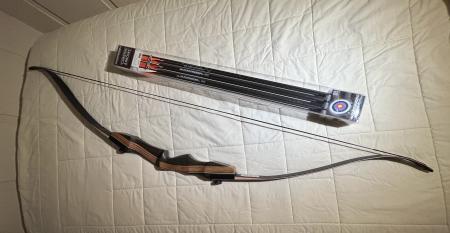 Break Down Recurve Bow and Six un-used Carbon arrows (Still in un-opened box). Excellent entry level bow for adult or teenage users. Purchased in 2017 but never used (Covid problems) – retailed (Bow) at that time for $129.95 – now on Samick website for $139.95 – arrows purchased for $49.99 at that time. Images above from from Smack website provide product info and show current price for bow. The photo of the assembled bow and box of arrows from my cell phone. Will sell the bow and the arrows for $100.00. Call Ken in Manzanita @ 503-936-3860
