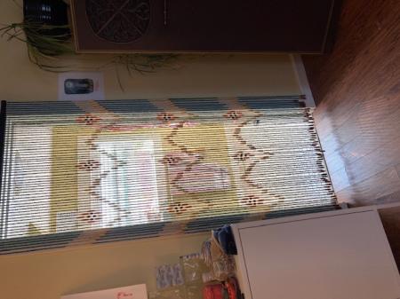 Beautiful handmade bamboo beaded curtain for doorway or room divider. Main color is teal, with cream, orange, and brown accents. Like new. 35.25″L x 78″H. $50