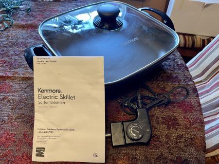 Kenmore electric skillet— like new; 12″ x 12″ (30.5 x 30.5 cm) cooking area with high sides; Durable non-stick coating lets you sear food without sticking; Vented tempered glass lid with insulated handle; 1350W heating element heats up quickly and evenly