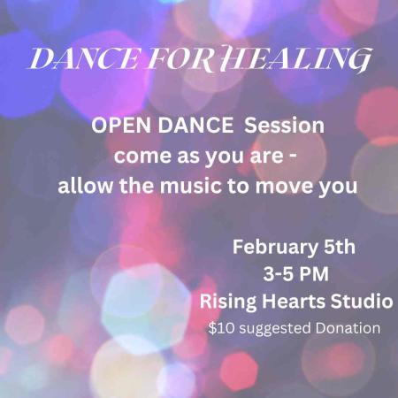 This Sunday at Rising Hearts Studio, Dance for Healing Open Dance Session from 3-5 PM – come for 10 minutes or two hours.