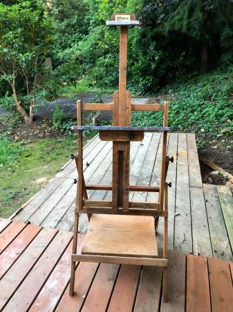 For sale is my used, BEST brand deluxe easel. Built of solid oak, the quad base easel is perfect for the mixed media painter. It is very sturdy and can be folded for storing. Can be used vertically for sketching or painting, and adjusted to a horizontal position for watercolor, applying gesso or varnishing. Features a built in shelf for supplies or books. $75 (online new $350)