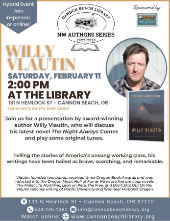 The Cannon Beach Library welcomes award-winning author and musician Willy Vlautin at 2 p.m. Saturday, Feb. 11. Vlautin will discuss his latest novel, The Night Always Comes, and he also will play original tunes that accompany his works. The presentation is part of the library’s NW Authors Series.