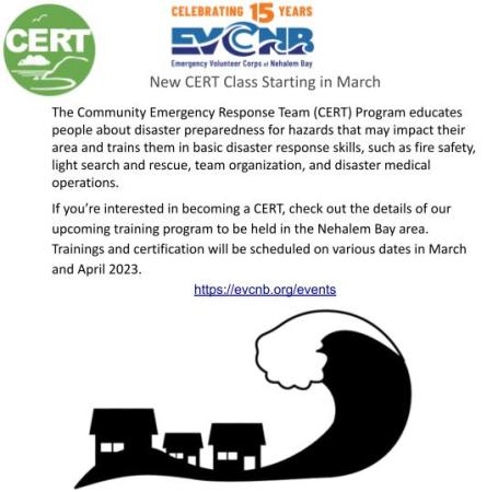 Sign up to get training and certification as a Community Emergency Response Team member. Training and certification are free. You’ll learn important skills not only to help yourself and your family in a disaster, but others in your community.