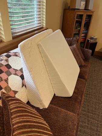 Used after Macular and subsequent Cataract surgery to elevate head. No longer need. Non-pet home, used with regular pillow on top. Can also be used to help with acid reflux per manufacturer. Paid $59 each, now two for $50. Also have round pillow with hole to place face and u-shaped pillow for side sleeper position. I sewed to assist in not sleeping on eye during healing. Similar to travel pillows. Free with purchase of wedge pillows. Jan Fisher
