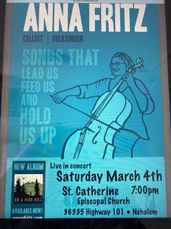 Anna Fritz, cellist and singer/songwriter will be in concert at St Catherine Episcopal Church at 7pm on Saturday March 4. Anna and her cello also will accompany labyrinth walkers on Sunday March 5th between 3 and 5pm. For more information contact Cathy by email: aquietplace@nehalemtel.net