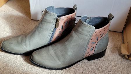 Stylish size 39 (US size 8) ankle boots very lightly used $50 HP color laser printer and 3 colors cartridges $150. Small wicker and glass patio table new in box $40 peek.paula1@gmail.com