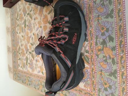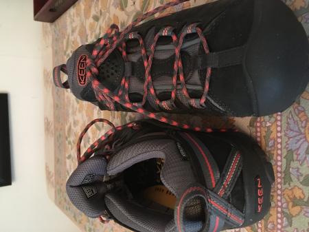 For Sale: 1 pair of women’s Keens size 9.5. Style: Targhee II, waterproof. Charcoal grey with red trim.