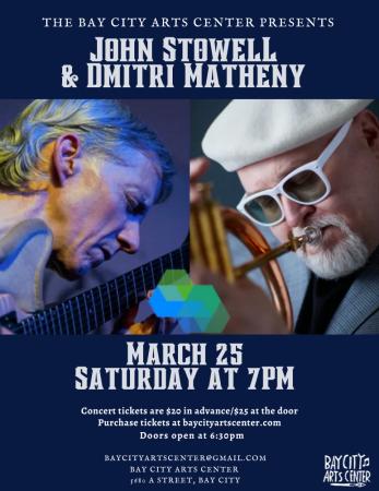Saturday March 25 at 7pm, BCAC will have an evening of music with the duo of Pacific Northwest jazz artists, guitarist John Stowell and flugelhornist Dmitri Matheny. Concert tickets are $20 in advance, $25 at the door. Doors open at 6:30pm. Get your tickets at the following link: checkout.square.site/buy/MDI6FDR2T3YGHB4HAPL2SWEA