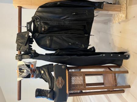 Ladies Wilson Leather jacket with liner size L, Wilson leather chaps size M, Ladies Harley Davidson Boots size 9-1/2, Ladies Harley Davidson Gloves.