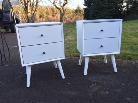 2 White Mid Century Modern Nightstands with 2 drawers. Wood construction, drawers are sturdy, smooth to open and close. Excellent condition. Askng $150 each or $300 for the pair. Located in Nehalem. Email or text Ashley if interested 503-457-8141