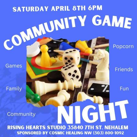 Tomorrow, Saturday April 8th, is Community Game Night at Rising Hearts Studio. We start at 6PM. This is a free, community event, where ALL are welcome. Come join us for some fun playing games with your neighbors and friends. Bring your own favorite game to share, or play one of ours. Hope to see you there!