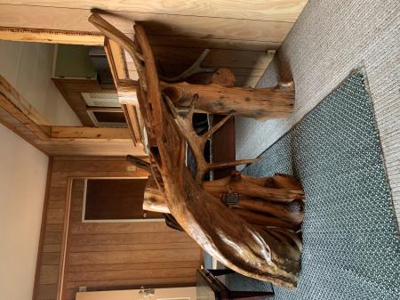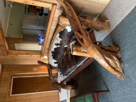Selling this really unique handmade live edge and antlers couch with a cow hide.